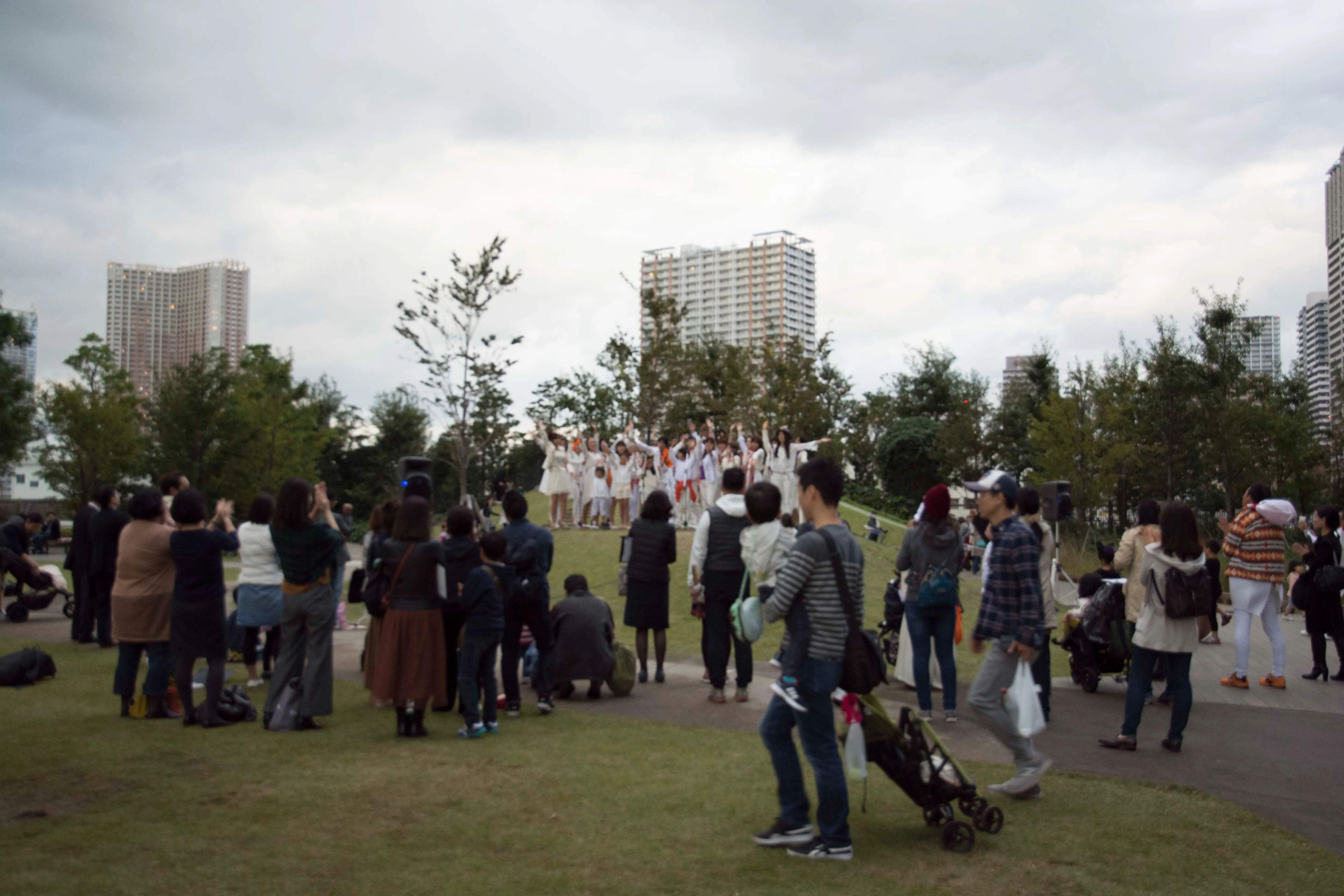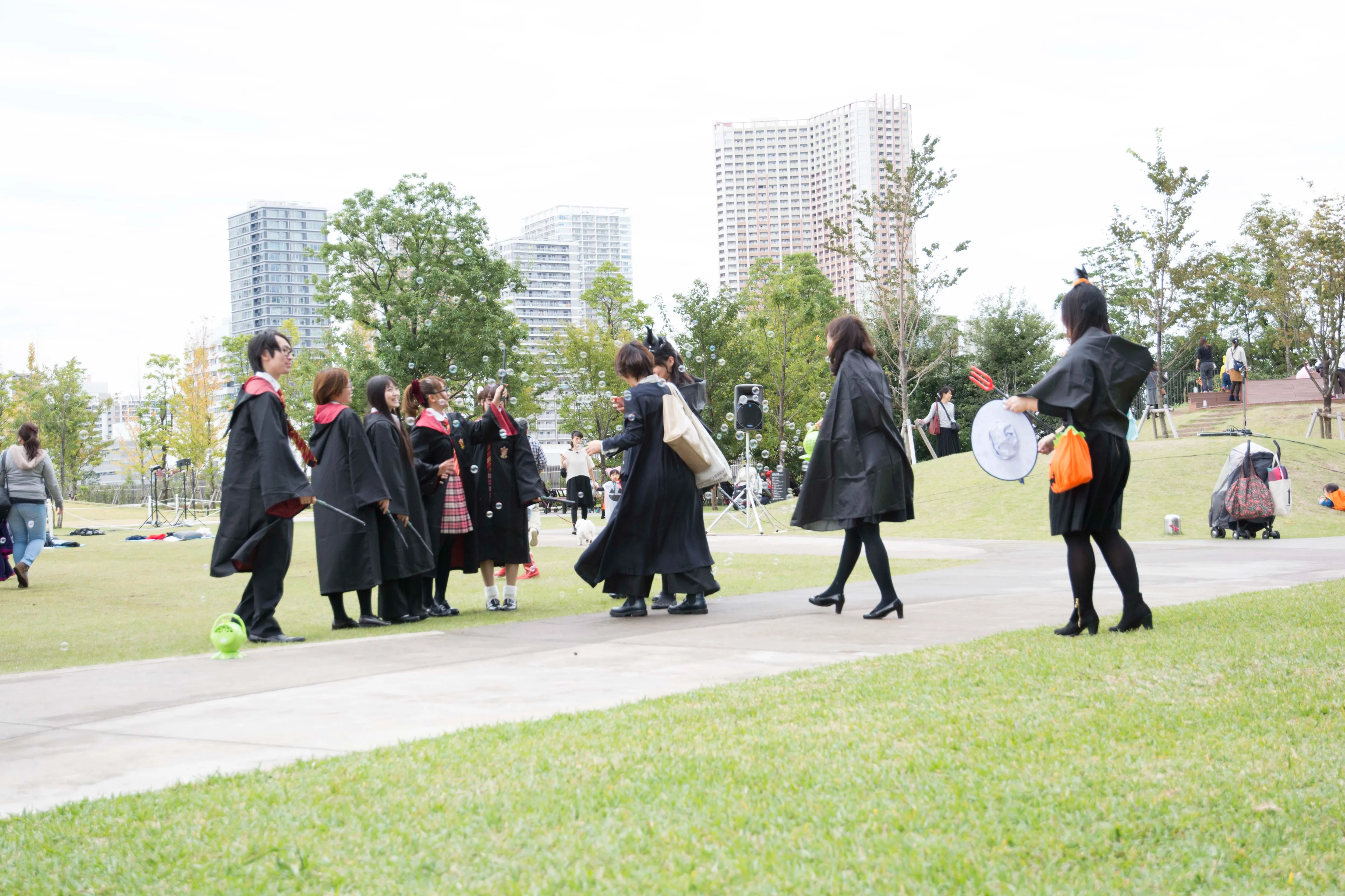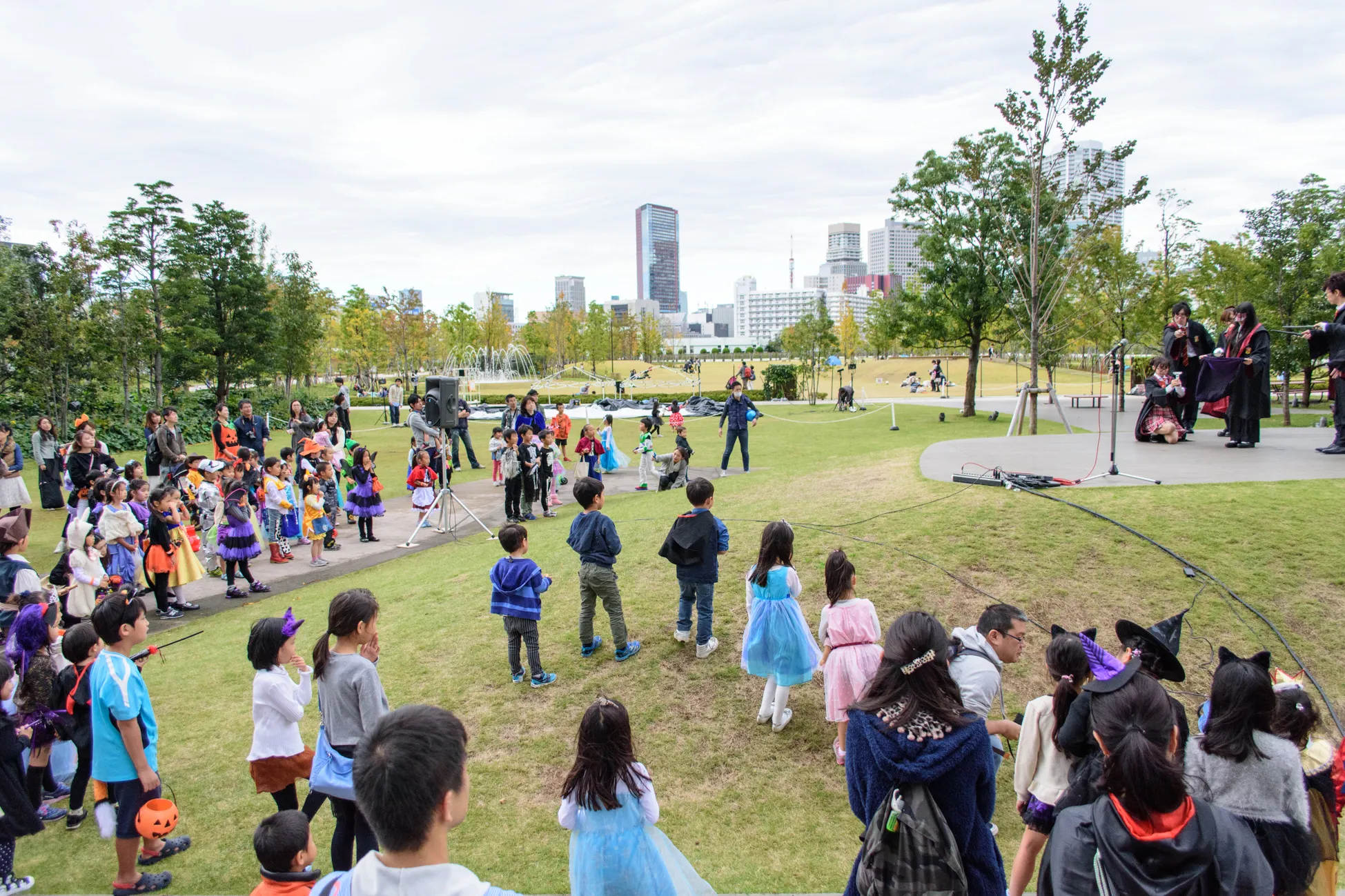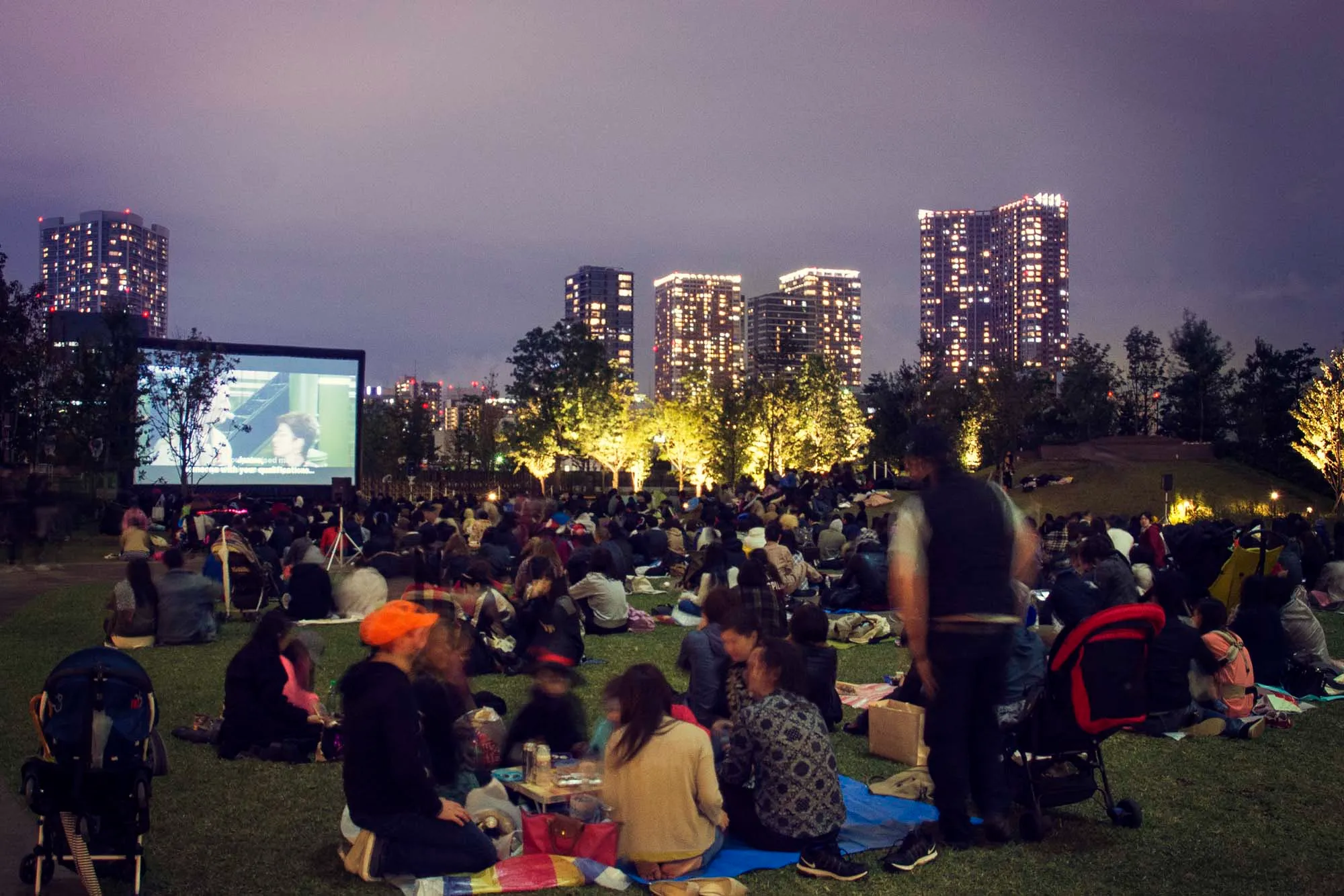 広大な芝生の上に設置された巨大スクリーンで、ハロウィンにちなんだ映画『ゴーストバスターズ』が無料上映され、東京のビル夜景を背景に仮装した来場者が映画鑑賞を楽しみました。